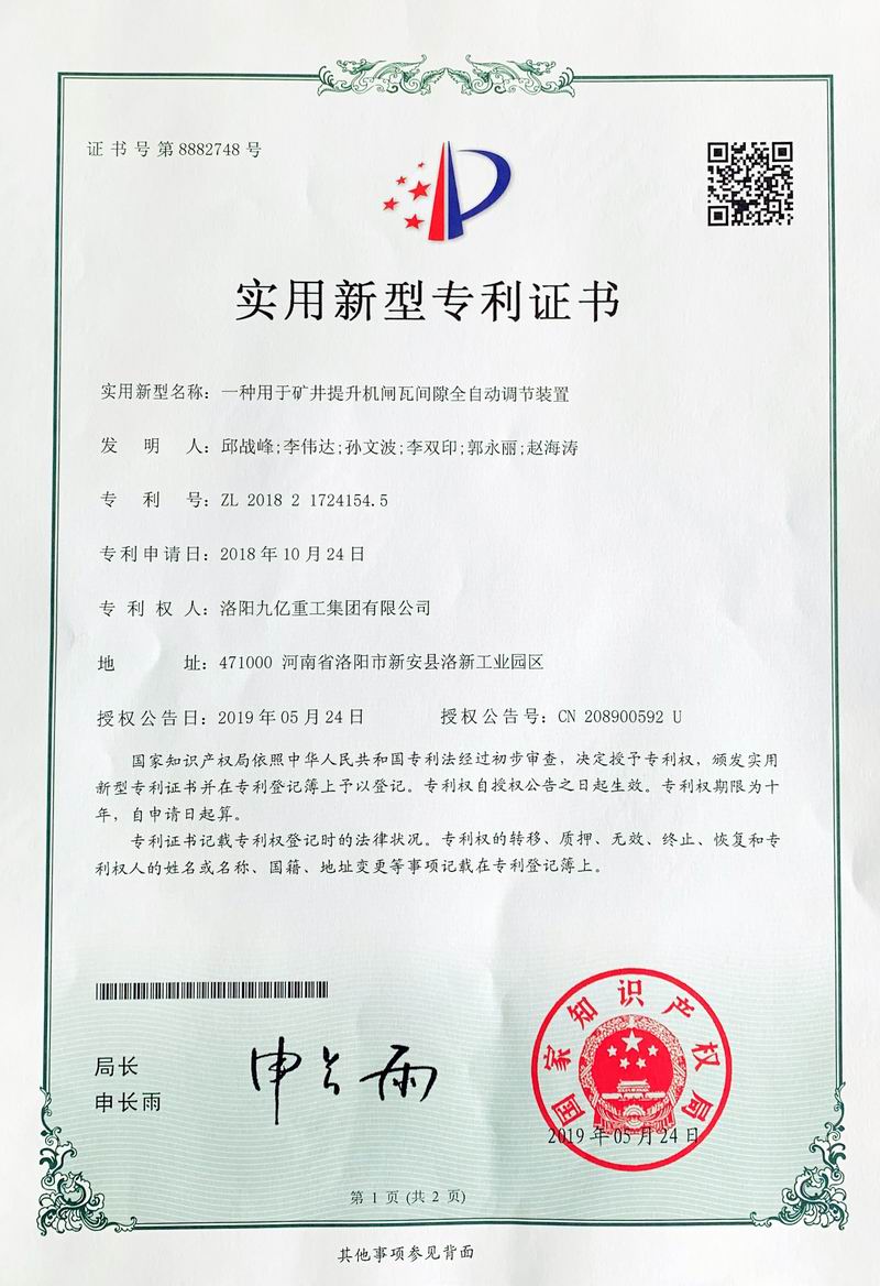 闸瓦间隙全自动调节装置证书
